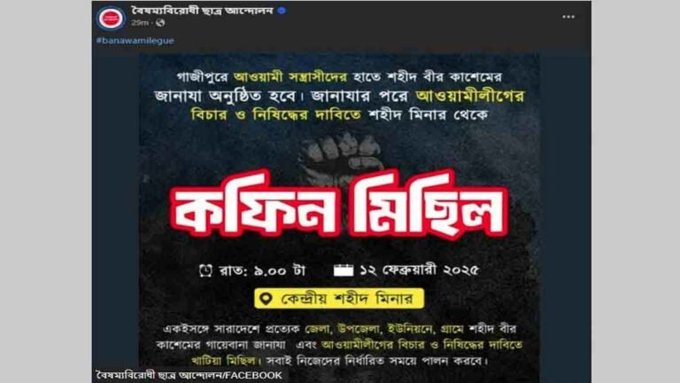 একইসঙ্গে নিজেদের নির্ধারিত সময়ে ‘সারাদেশে প্রত্যেক জেলা, উপজেলা, ইউনিয়নে, গ্রামে শহীদ বীর কাশেমের গায়েবানা জানাজা এবং আওয়ামী লীগের বিচার ও নিষিদ্ধের দাবিতে খাটিয়া মিছিল’ করারও আহ্বান জানানো হয়।