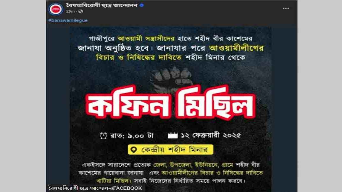 সংগঠনটির ঘোষণা অনুযায়ী, আগামীকাল বৃহস্পতিবার সকাল নয়টায় কেন্দ্রীয় শহীদ মিনারে আবুল কাশেমের জানাজা অনুষ্ঠিত হবে। তারপর সেখান থেকেই ‘আওয়ামী লীগের বিচার ও নিষিদ্ধের দাবিতে’ কফিন মিছিল হবে।