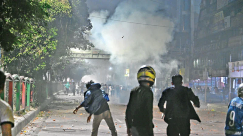 নন্দী টিভি ডেস্ক: ঢাকা বিশ্ববিদ্যালয় (ঢাবি) অধিভুক্ত সাত কলেজের শিক্ষার্থী ও ঢাবি শিক্ষার্থীদের মধ্যে সংঘর্ষ ও পাল্টাপাল্টি ধাওয়ার ঘটনা ঘটেছে। রোববার রাত ১১টার দিকে নীলক্ষেত মোড়-সংলগ্ন বিশ্ববিদ্যালয়ের মুক্তি ও গণতন্ত্র তোরণের সামনে এ ঘটনা শুরু হয়। রণক্ষেত্রে পরিণত হয় নীলক্ষেত ও নিউমার্কেট এলাকা। মুহুর্মুহু সাউন্ড গ্রেনেড ও টিয়ার গ্যাসের শেল নিক্ষেপে মধ্যরাতে কেঁপে ওঠে আশপাশ। রাত আড়াইটায় এ প্রতিবেদন লেখা পর্যন্ত উভয় পক্ষ মুখোমুখি অবস্থানে ছিল। থেমে থেমে চলছিল ইটপাটকেল নিক্ষেপ ও ধাওয়া-পাল্টা ধাওয়া। এতে অন্তত ৬ জন আহত হয়েছেন। তাৎক্ষণিক তাদের নাম জানা যায়নি। পরিস্থিতি নিয়ন্ত্রণে অতিরিক্ত পুলিশ ও চার প্ল্যাটুন বিজিবি মোতায়েন করা হয়। উদ্ভূত পরিস্থিতিতে ঢাবিতে আজ সোমবার সব ক্লাস-পরীক্ষা স্থগিত করেছে প্রশাসন।
