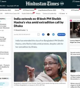 নন্দী ডেস্ক: ছাত্র-জনতার গণঅভ্যুত্থানের মুখে ভারতে আশ্রয় নেওয়া বাংলাদেশের সাবেক প্রধানমন্ত্রী শেখ হাসিনার ভিসার মেয়াদ বাড়িয়েছে মোদি সরকার। শেখ হাসিনাকে প্রত্যর্পণে ঢাকার পক্ষ থেকে ক্রমবর্ধমান চাপের মধ্যেই এমন সিদ্ধান্ত নিয়েছে দিল্লি। গুম ও জুলাই গণহত্যার অভিযোগে শেখ হাসিনাসহ ৯৭ জনের পাসপোর্ট বাতিলের বিষয়ে অন্তর্বর্তী সরকারের পক্ষ থেকে জানানোর পরই এমন খবর দিলো হিন্দুস্তান টাইমস।