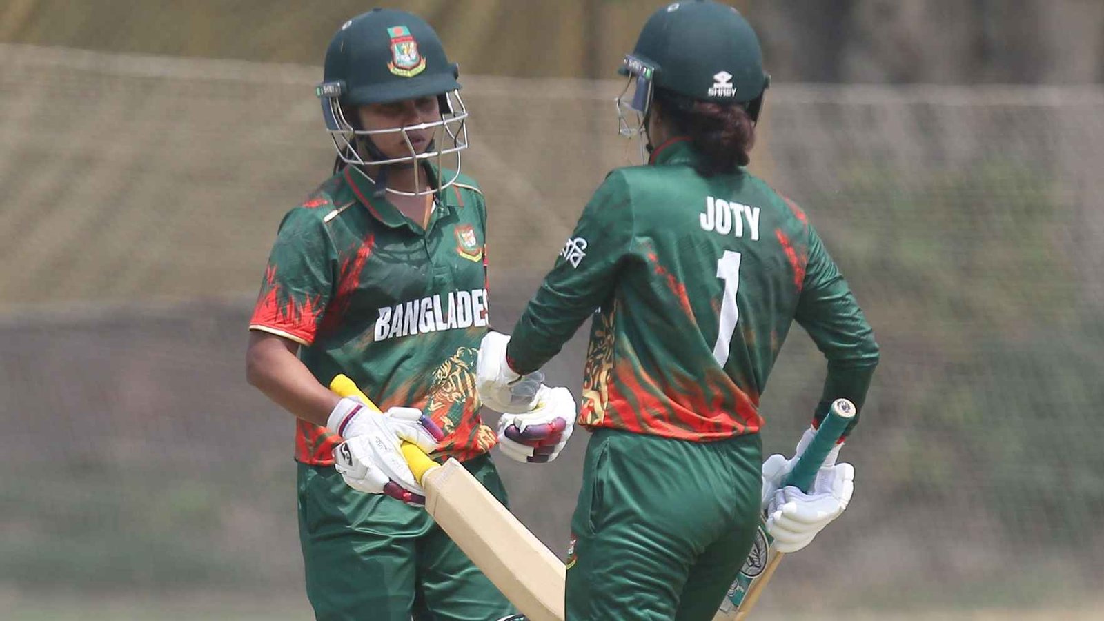 আগে ব্যাট করতে নেমে ইশমা তানজিম এবং পিংকির ব্যাটে ৩৫ রানের জুটি গড়ে বাংলাদেশ। নবম ওভারে চ্যাটার্জির শিকার হয়ে দলীয় ৩৫ রানে ফেরেন ইশমা। ২৯ বলে ১৪ রান করেছেন এই ওপেনার। পরে দ্বিতীয় উইকেট জুটিতে খেলার হাল ধরেন শারমিন আক্তার এবং পিংকি।