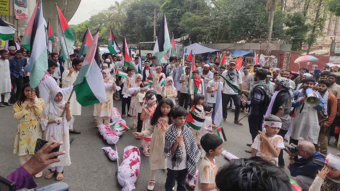 শনিবার (১২ এপ্রিল) দুপুর ২টায় এই ব্যতিক্রমধর্মী প্রতিবাদী কর্মসূচি পালন করেছে সায়মুম শিল্পীগোষ্ঠীর কর্মী ও স্বেচ্ছাসেবীরা। মার্চ ফর গাজা কর্মসূচির সমর্থনে এ আয়োজন করা হয়েছে বলে জানা যায়। এছাড়া কর্মসূচিতে যুক্তরাষ্ট্রের প্রেসিডেন্ট ট্রাম্প ও ইসরায়েলের প্রধানমন্ত্রী নেতানিয়াহুর রক্তাক্ত সংলাপেরও একটি দৃশ্য অভিনয় করে দেখানো হয়েছে।