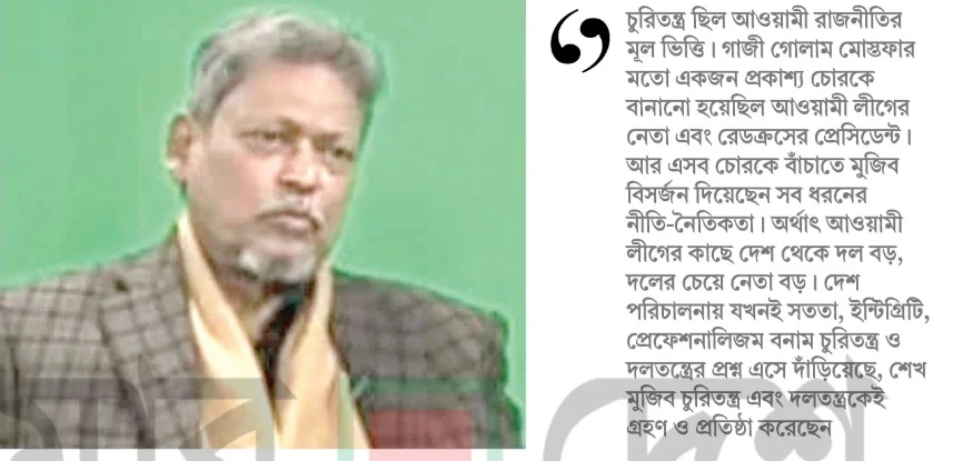 ৩. চুরিতন্ত্র ছিল আওয়ামী রাজনীতির মূল ভিত্তি। গাজী গোলাম মোস্তফার মতো একজন প্রকাশ্য চোরকে বানানো হয়েছিল আওয়ামী লীগের নেতা এবং রেডক্রসের প্রেসিডেন্ট। আর এসব চোরকে বাঁচাতে মুজিব বিসর্জন দিয়েছে সব ধরনের নীতি-নৈতিকতা। অর্থাৎ আওয়ামী লীগের কাছে দেশ থেকে দল বড়, দলের চেয়ে নেতা বড়। দেশ পরিচালনায় যখনই সততা, ইন্টিগ্রিটি, প্রেফেশনালিজম বনাম চুরিতন্ত্র ও দলতন্ত্রের প্রশ্ন এসে দাঁড়িয়েছে, শেখ মুজিব চুরিতন্ত্র এবং দলতন্ত্রকেই গ্রহণ ও প্রতিষ্ঠা করেছেন।